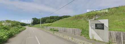 国道238号線、網走に向かって、常呂の街を出て常呂大橋をわたると同時に十字路にさしかかり、そこを右折すると、左側の法面に貝塚が見えてきます、朝日トコロ貝塚です。