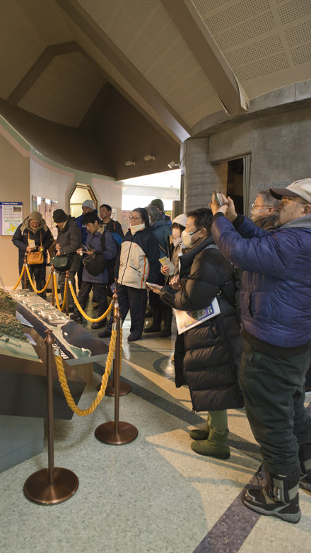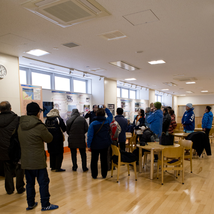 俱楽部の担当者から、ホールの歴史やLSロコ・ソラーレエピソードなどの説明を受ける、ホールの観客席では観光客がカーリングの体験の仕方などをトレーナーから熱心聞き入っている