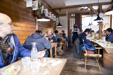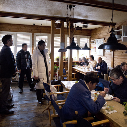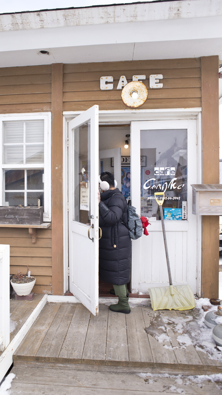 北見市常呂交通ターミナル(旧常呂駅)の駐車場に到着、降車後徒歩で1分、昼食の「常呂Cafe しゃべりたい」のドアーをくぐる